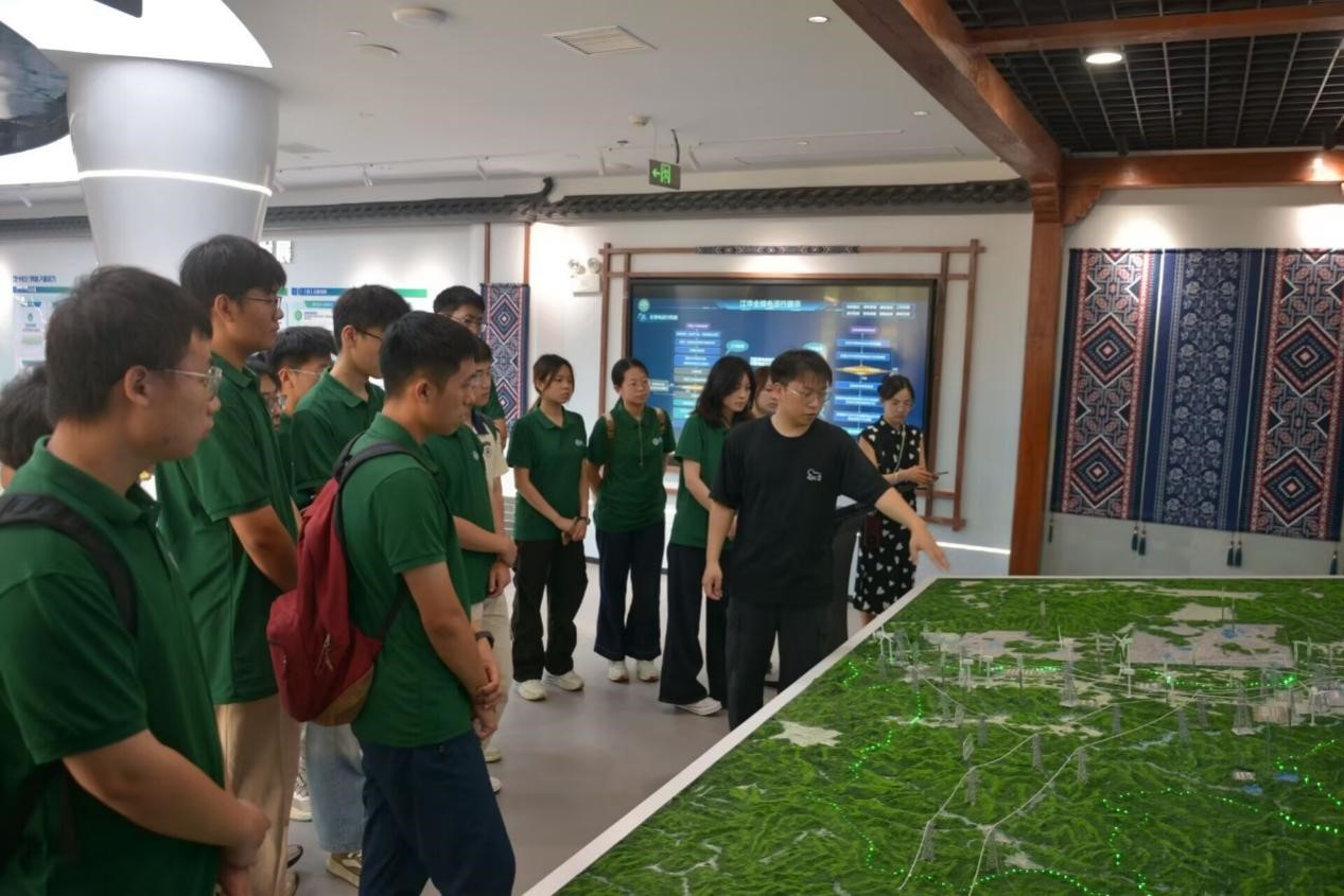 “截至2024年,江华县电源装机容量136万千瓦,清洁能源占比100%,全年全绿电运行时间占比96.06%,最大连续运行107天,居全国第一。”李师傅用一组组亮眼数据,向同学们展示了这座“绿电高地”的硬核实力。展厅内,风机、光伏、储能沙盘实时闪烁,将“源网荷储”协同运行的奥秘直观呈现,同学们认真记录与聆听。