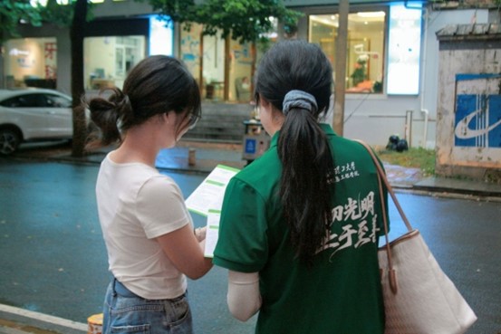 实践队员们携带精心编制的宣传手册、政策解读海报等材料抵达现场。他们科学分组、协同行动,沿贤童街向过往居民与商户发放宣传资料,用平实生动的语言细致解读“奖、助、贷、勤、免(减)、补”六位一体资助政策核心内容,涵盖助学金额标准、申请资格条件及办理操作流程等关键信息。