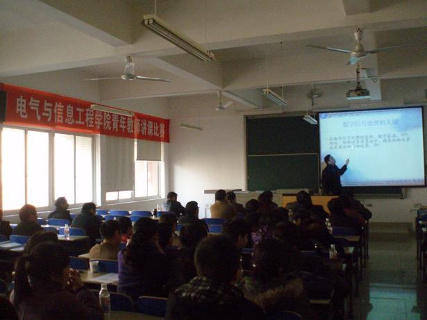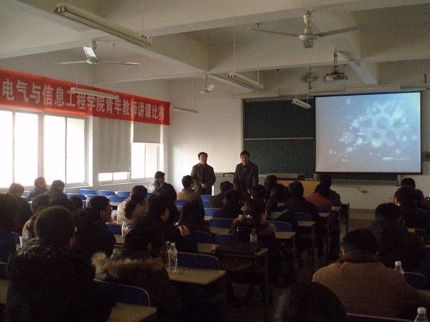 20111213日和1215,电气与信息工程学院青年教师讲课比赛决赛分别在云塘校区工科一号楼B-205和金盆岭校区电苑楼704举行。教务处处长李录平教授,质量监控与评估办公室主任刘晓平教授,校工会副主席向洋教授等出席决赛开赛并讲话。决赛评委团成员由校教学督导团团长高纯一教授和学院督导团成员共7人组成;决赛仲裁委员会由院党委书记何纯芳,院长曾祥君教授、院党委副书记、工会主席张国强和各系、中心主任组成。副院长马瑞教授主持会议。