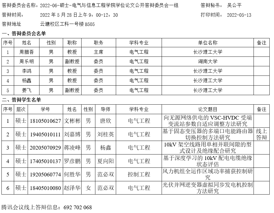 电气与信息工程学院2022年6月毕业研究生学院公开答辩一组已发布,请相关同学提前打印准备好《答辩表决票》、《答辩安排表》、《答辩申请表》,于答辩前5个工作日提交得到工一B501研究生办完成盖章并做好相关答辩准备。