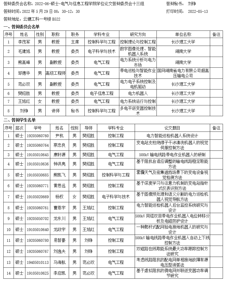 电气与信息工程学院2022年6月毕业研究生答辩安排(十三)已发布,请相关同学提前打印准备好《答辩表决票》、《答辩安排表》、《答辩申请表》,于答辩前5个工作日提交得到工一B501研究生办完成盖章并做好相关答辩准备。