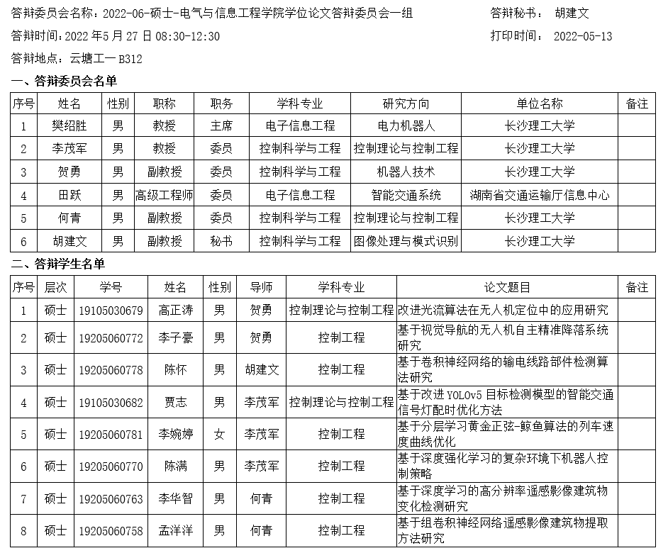 电气与信息工程学院2022年6月毕业研究生答辩安排(一)已发布,请相关同学提前打印准备好《答辩表决票》、《答辩安排表》、《答辩申请表》,于答辩前5个工作日提交得到工一B501研究生办完成盖章并做好相关答辩准备。