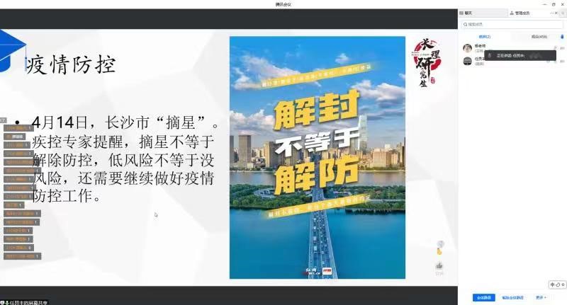 任艮丰从校园疫情防控以及校园交通安全两个方面为全体研究生解读相关政策,讲授安全知识,并强调“非必要不出校,非十分必要不离长”,要求全体研究生严格遵守疫情防控相关要求,积极配合防疫工作,同时在校内规范使用电动车,提高交通及充电安全意识。会议最后杨湘怡为全体研究生答疑解惑。
