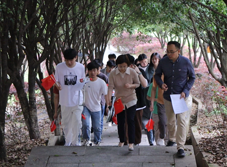 春日阳光正好,师生在云霞山脚下集合、领取物资后,开启了这次特别的“踏青”之旅,一边交流一边登上九云方鼎。