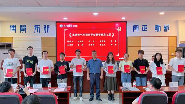“东塘电气专项奖学金”由郴州市东塘电气设备有限公司出资设立,用于奖励我院家庭经济困难、自强不息、品学兼优的大学生和学生干部。颁奖典礼上,伍接朝代表学院对郴州市东塘电气设备有限公司的慷慨捐赠表示衷心感谢,对获奖的同学们表示热烈的祝贺。他回顾了过去一年学院在学术科研、人才培养、学科建设等方面取得的成就,希望与企业进一步推动产教融合,通过校企合作为祖国的电力事业培养更多人才,同时勉励同学们牢记总书记嘱托,胸怀天下立大志,培根铸魂明大德,锐意进取成大才,实干笃行担大任,在真刀真枪的奋斗中成就一番事业,为祖国的建设与发展贡献长理电气智慧与力量。
