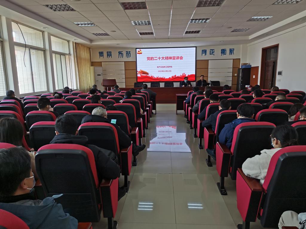 12月12日下午,校党委副书记、校长曹一家莅临电气学院,在学院学术报告厅宣讲党的二十大精神。宣讲会由院党委书记伍接朝主持,学院领导班子及全院教工党员和学生党员代表参加。