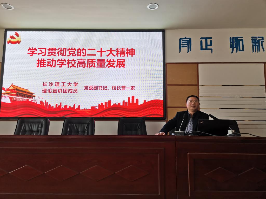 曹一家以“学习贯彻党的二十大精神,推动学校高质量发展”为题,围绕全面领会党的二十大主题及主要成果、深刻认识过去五年的工作和新时代十年的伟大变革、不断开辟马克思主义中国化时代化新境界、深入学习了解中国式现代化、全面建设社会主义现代化国家的目标任务、坚持党的全面领导和全面从严治党、应对风险挑战、坚定不移地办好人民满意的大学等八个方面,对党的二十大精神进行了系统阐释和深入解读。他强调,作为高校教育工作者,学习贯彻党的二十大精神,落脚点就在坚守为党育人、为国育才的初心使命,紧紧围绕学校中心工作,坚持内涵发展、特色发展,为服务现代化建设的发展大局贡献自己的智慧与力量。