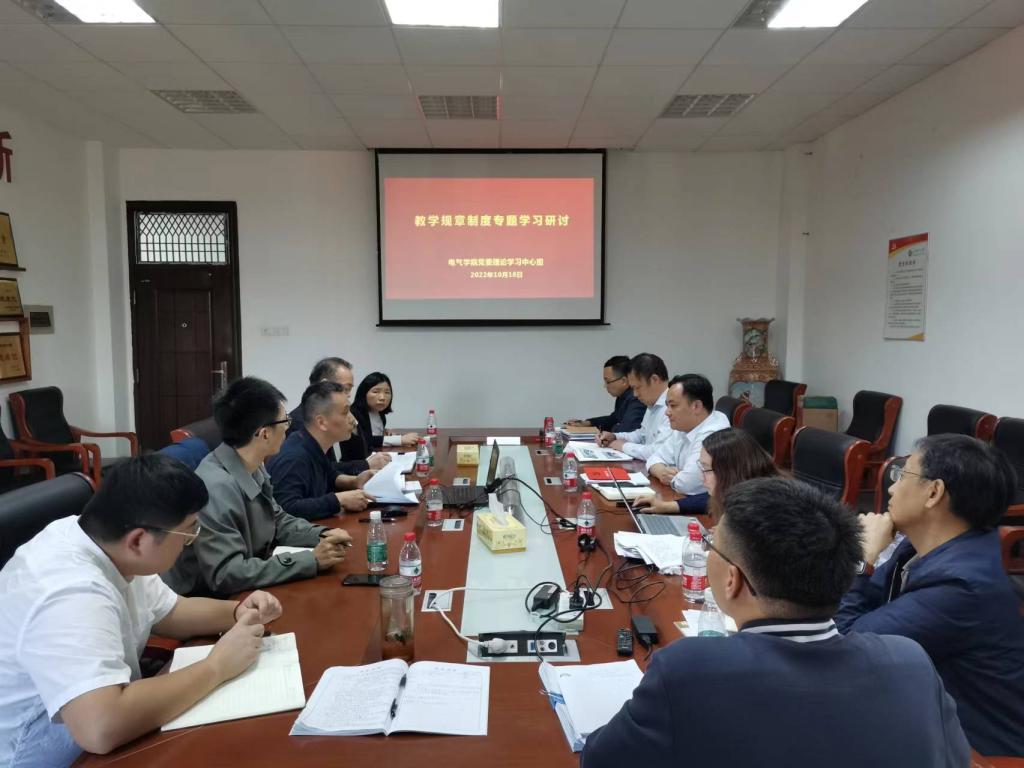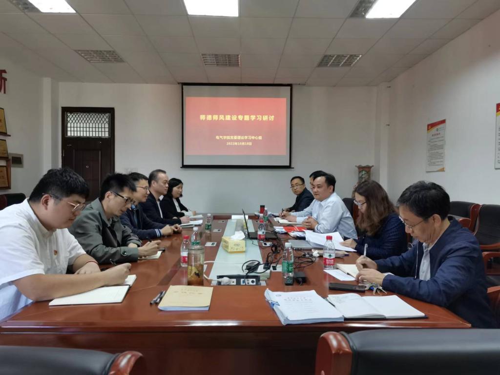 10月18日下午,电气学院党委理论学习中心组在工一B505开展师德师风建设专题学习讨论。学习会由学院党委书记伍接朝主持,学院领导班子全体成员、各系系主任、党支部书记参加。