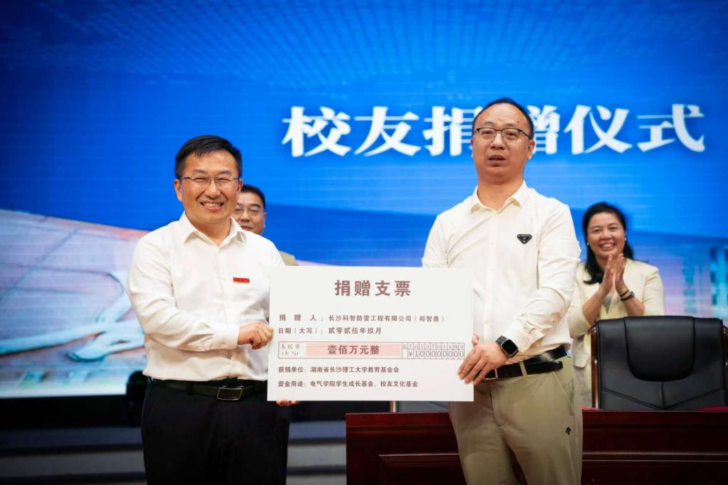 9月23日,学院1999届校友、长沙科智防雷工程有限公司董事长兼总经理郑智勇先生捐赠仪式在2025级新生“电苑第一课”现场举行。副校长张军辉出席并讲话,校友中心主任唐青,学校教育基金会秘书长肖晖,学工部、校团委相关领导,学院党委书记丁丹、院长陆佳政等院领导参加。