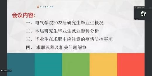 为帮助研究生了解当前就业形势,促进研究生顺利就业,20221012日下午,电气学院召开了线上2023届研究生毕业生就业促进工作会议,欧彩玲老师主讲,2023届全体研究生参会。