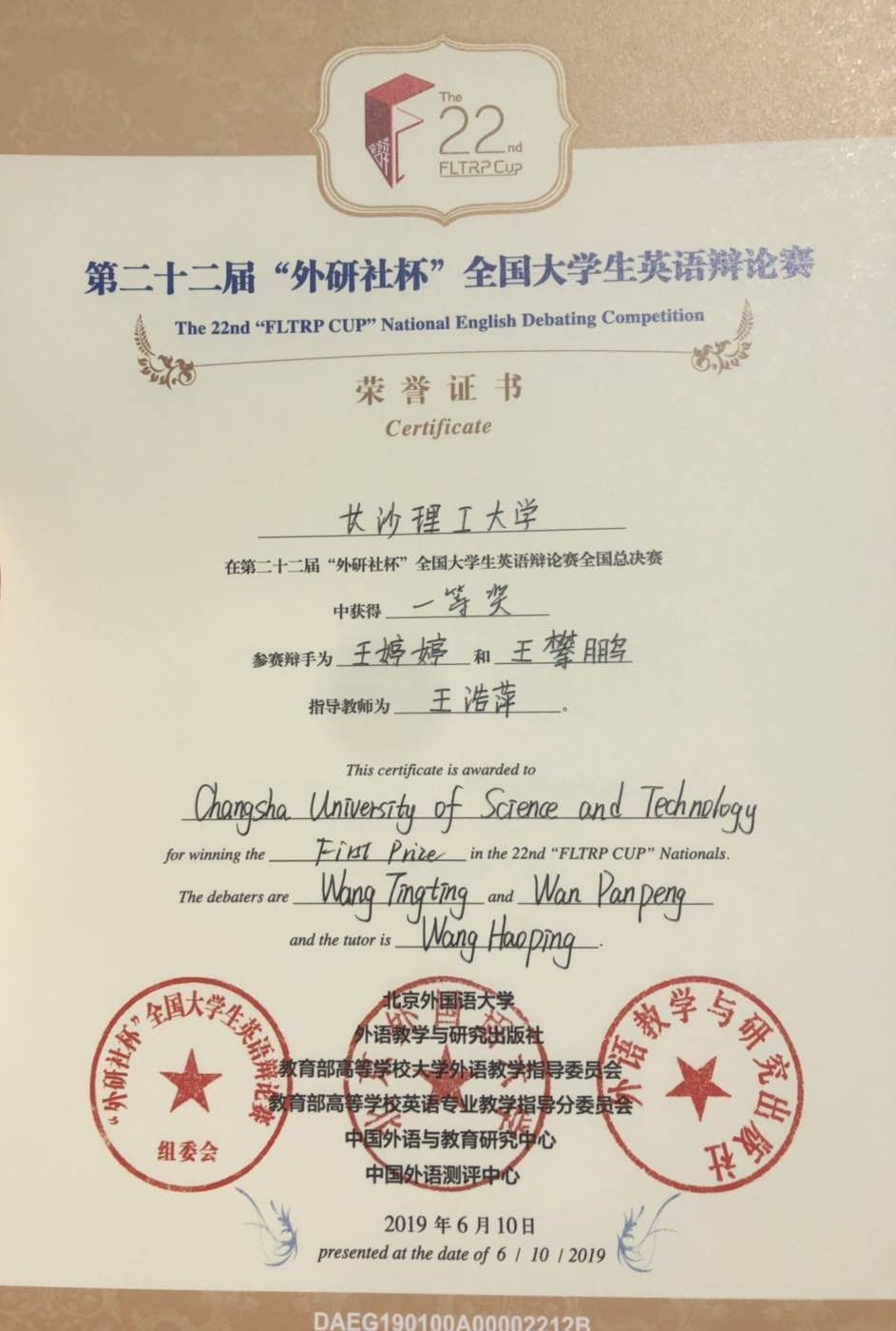 永利官网外国语学院16级英语专业王婷婷和17级翻译专业王攀鹏同学组成代表队参加比赛,由王浩萍担任指导老师兼领队。经过八轮循环赛、八分之一决赛和四分之一决赛的对决,永利官网代表队凭借良好的逻辑思维能力、口头表达能力和临场应变能力,最终夺得大赛一等奖。