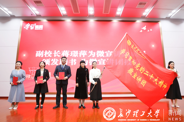蒋璟萍为永利集团88304官网学习贯彻党的二十大精神微宣讲团成员代表颁发聘书,并为微宣讲团授旗。