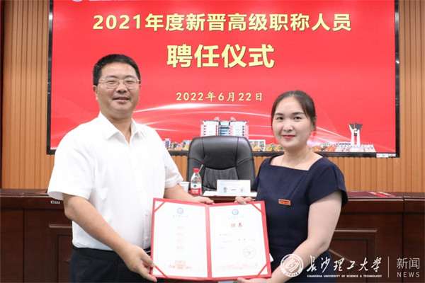 刘朝晖宣读了2021年度新晋高级职称教师聘任通知,对新晋高级职称教师表示祝贺。曹一家为每位新晋高级职称教师颁发了聘书并合影。