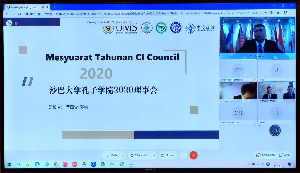 12月8日上午10点,沙巴大学孔子学院第二届理事会会议在线上举行。会议由沙巴大学孔子学院主办,永利官网和中交疏浚集团协办。沙巴大学校长拿督Taufiq Yap Yun Hin教授、永利官网副校长蒋昌波教授、中交疏浚集团副总裁关巍,孔子学院中外方院长等16名理事会成员参加会议。