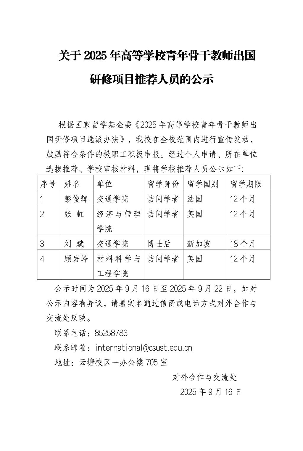 关于2025年高等学校青年骨干教师出国研修项目推荐人员的公示