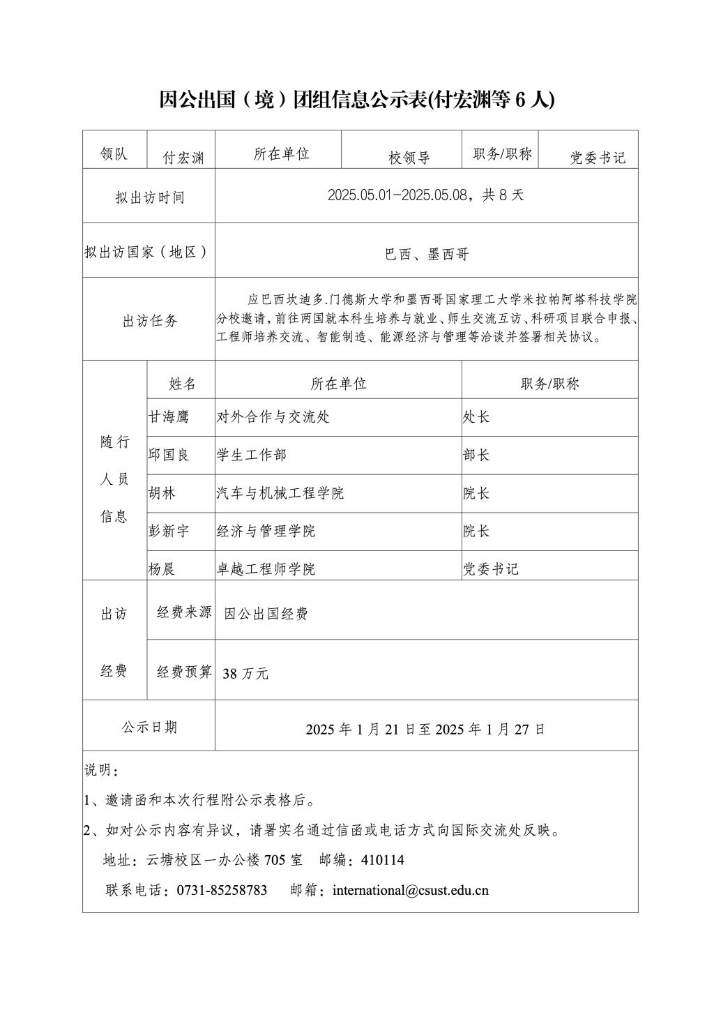 因公出国(境)团组信息公示表(付宏渊等6人)