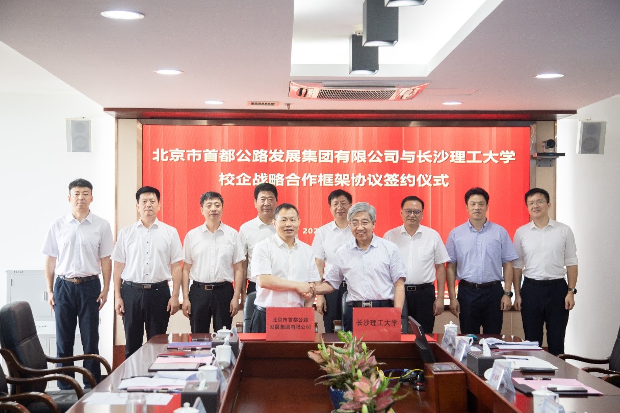 刘朝晖代表学校与首发集团李振国签署了校企战略合作框架协议;郑健龙代表学校与首发集团陈卫东签署了公路养护技术国家工程研究中心合作协议签。