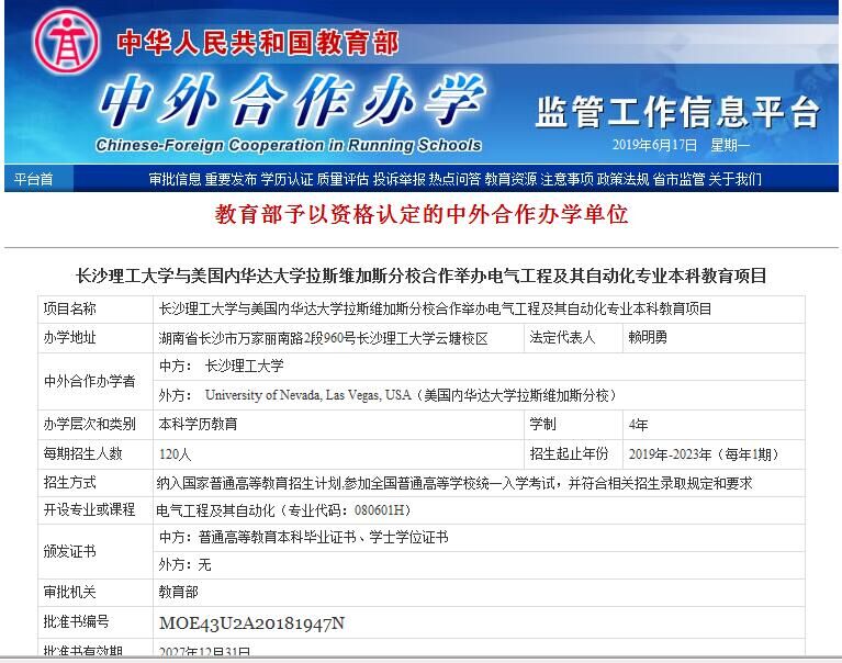 永利集团88304官网与美国内华达大学拉斯维加斯分校合作举办电气工程及其自动化专业本科教育项目于2018年获得教育部批准(编号:MOE43U2A20181947N),融合两校强势专业“电气工程”之优势,严格遵守《中外合作办学条例》和《中外合作办学条例实施办法》办学,紧密依托国际化、专业化的高水平管理团队运行。该项目融合中美双方优质教育资源,精心打造人才培养方案,其中1/3以上核心课程采用美方原版教材、师资、教学方式等优质教育资源,培养兼具国际化视野与家国情怀、拥有创新精神和跨文化交际能力、系统掌握电气工程专业基础理论知识和现代工程技术、具备良好科学素养与工程实践能力的应用型高级专门人才。