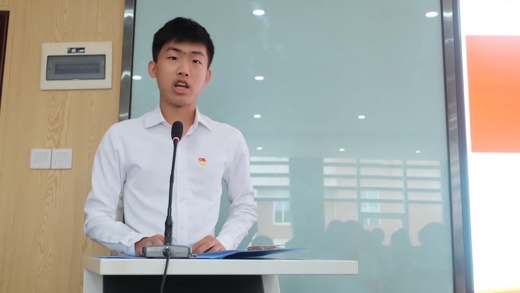 学生党员代表贺静南做入党初心分享。他回顾了师兄党员的示范引领作用和自己的入党动机,表示在未来的学习和工作中将继续以坚定的理想信念、过硬的知识本领担负起时代的使命与职责,践行初心。