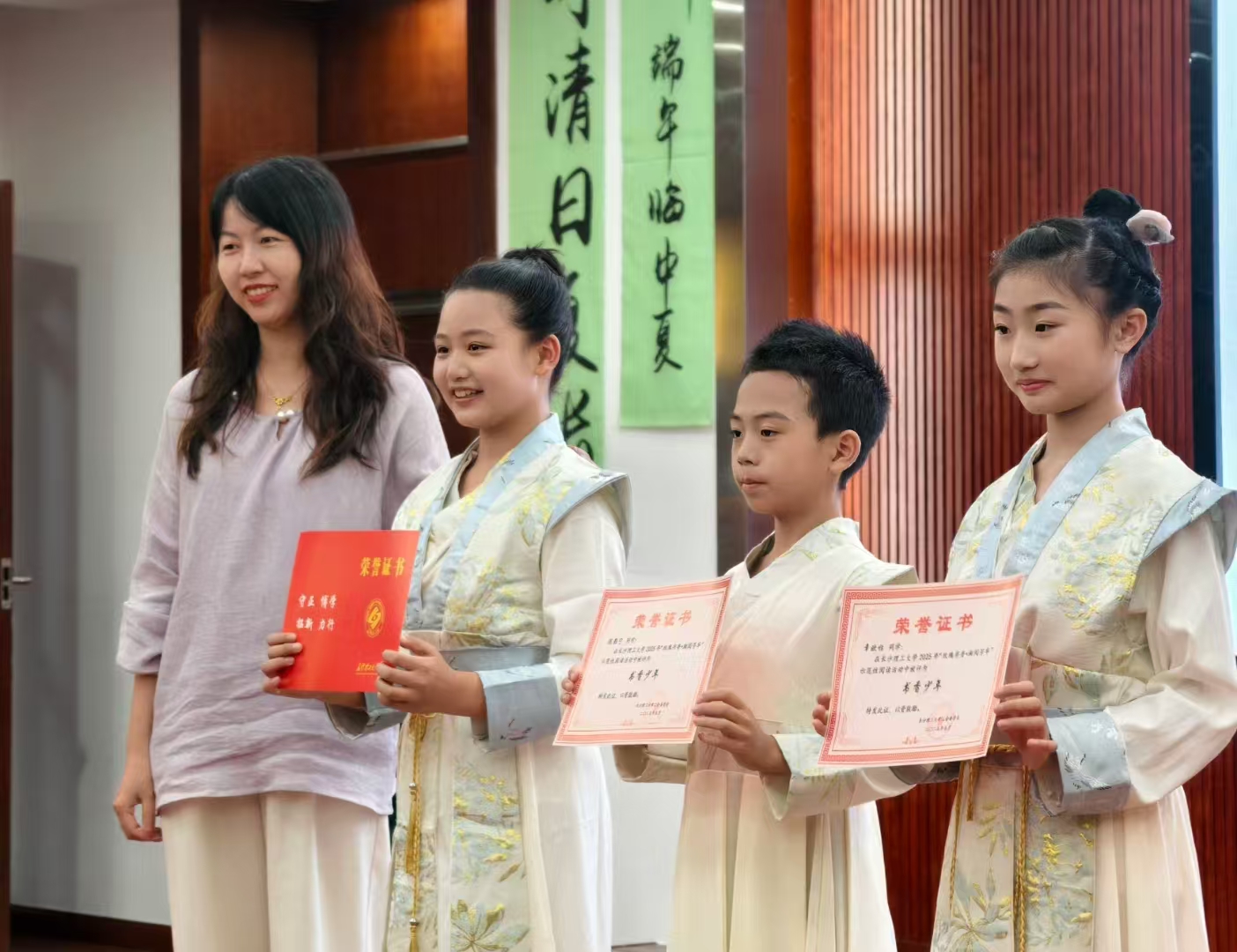 《天问·求索》由学院分工会主席黄文卫老师与欧彩玲老师,陈朵拉、章欧恬、陈颢宁3位孩子共同演绎。该节目的选题精准呼应了“传统节日”的主题内核。屈原以其对天地、历史、人生的磅礴发问,集中展现了华夏先贤探求真理的伟岸风骨与深沉家国情怀。节目在端午节前夕演绎,不仅是对伟大诗人的深情纪念,更是对大学所肩负的“求索”真理、培育时代新人使命的深刻呼应,彰显了文化自信的时代强音。其亲子朗诵形式,巧妙融合了家庭温情与传统文化的双重纽带。父母与子女在经典诗文的同频诵读中,不仅深化了亲子情感互动,更将屈原“路漫漫其修远兮,吾将上下而求索”的执着精神,化作润物无声的家教传承,为下一代注入了深厚的文化认同与价值引领。为呈现最佳效果,三组家庭挤出周末与工作日晚上的休息时间进行排练,反复打磨情感表达与配合默契度。表演现场,孩子们清澈而坚定的童声与两位母亲沉稳有力的诵读交织共鸣,赢得了热烈掌声。