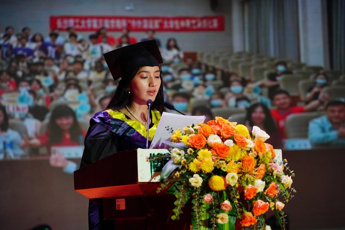 逐梦青春,奋发有为,四载学途磨砺,意气不减当年。来自机电类教改1901班的张李鹏回忆了四年来校园生活的欢笑和泪水,讲述了她用行动诠释校训“博学、力行、守正、拓新”的成长故事。“愿我们都能实现理想,书写精彩灿烂的人生”优秀毕业生代表黄秋山回顾了大学四年间担任学生干部、参加三下乡活动中的困难与收获,四年的大学时光他收获了挑战未知的勇气。“回首这段留学的时光,我们收获了知识,收获了友谊,更收获了面对困难和挫折时的坚持和勇敢。”留学生桑兰对中国的老师、同学们以及自己的家人表达感谢,她表示在中国的留学生活中,不仅得到了学术知识的指导,还受到了中华文化的熏陶,她更加包容和理解不同文化背景的人。