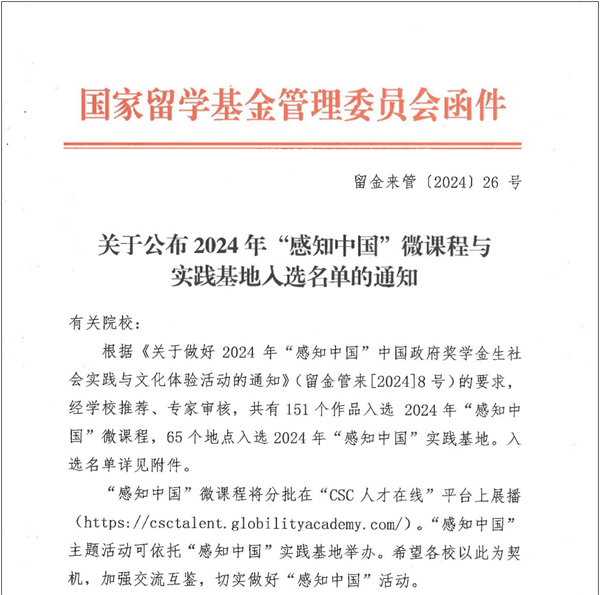 近日,国家留学基金管理委员会公布了2024年“感知中国”微课程与实践基地入选名单,永利官网申报的两门微课程和一个实践基地成功入选。