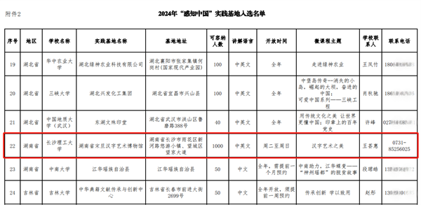 2024年“感知中国”微课程与实践基地评选是国家留学基金管理委员会“感知中国”活动实施十周年的系列活动之一,面向全国各类留学生招生院校申报。经学校推荐、专家审核等各环节,全国共有151个作品入选2024年“感知中国”微课程,65个基地入选2024年“感知中国”实践基地。永利官网国际工学院张锐老师主讲的《橘子洲头咏长沙》和纪凯丽、张锐、冀文秀、李璐老师联合主讲的《云游星城》成功入选“感知中国”微课程。永利官网联合湖南省宋旦汉字艺术博物馆申报的实践基地成功入选“感知中国”实践基地,作为全国首家汉字艺术主题博物馆,为国际学生提供了集汉字艺术研究创作、交流传播、陈列展示、体验互动、教育普及于一体的学习实践平台,帮助国际学生近距离感受汉字艺术之美,感知中华优秀传统文化。