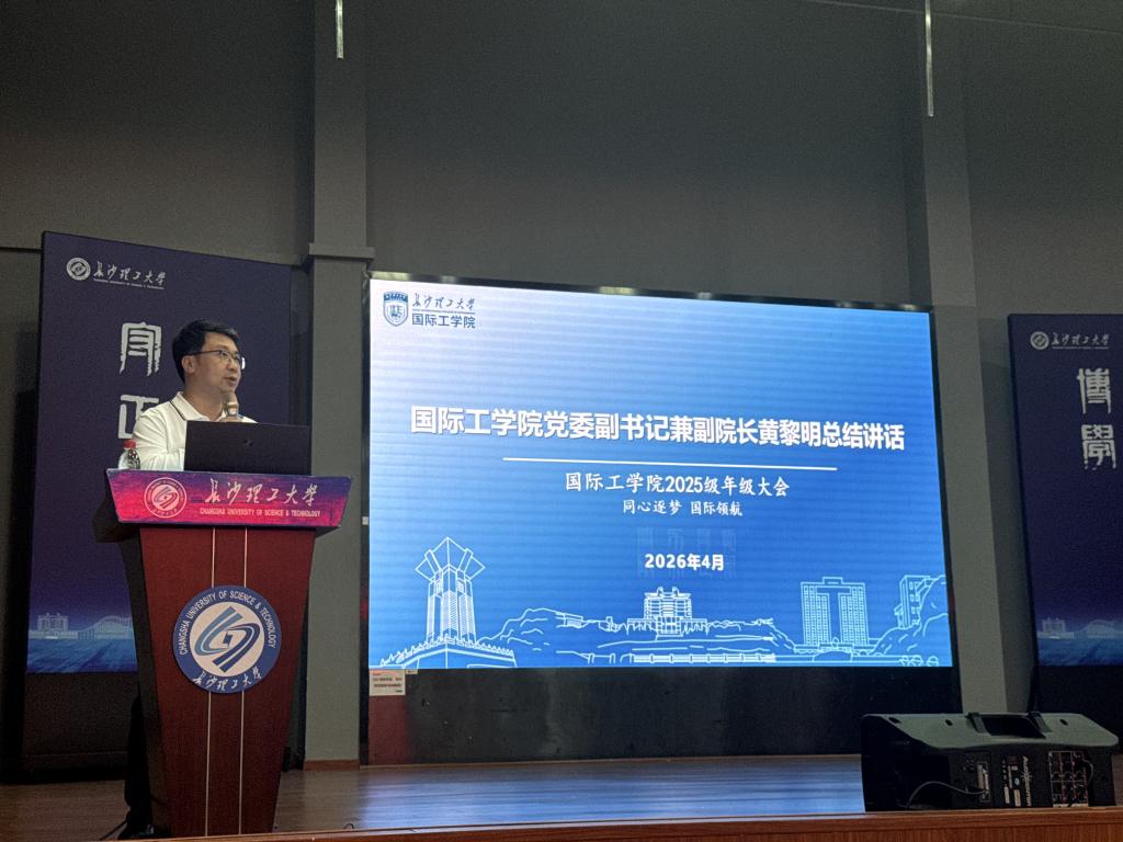 为进一步夯实学业基础、强化班级建设、筑牢安全防线,帮助2025级学生明确成长方向、规划大学发展路径,2026年4月14日下午,国际工学院于云塘校区学生活动中心科技报告厅召开2025级年级大会。学院党委副书记兼副院长黄黎明,教务办老师罗帅,辅导员熊英、魏涛,暮云派出所民警李士航,优秀校友、学生代表及2025级全体同学参加本次会议,会议由土木2503班李翰维主持。