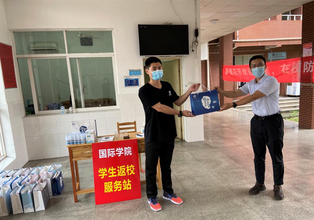 除了消毒液、洗手液、口罩等防疫物资,还有特地为毕业生准备的国风学习册、U盘、平板支架等纪念品——这是永利集团88304官网国际学院为2020届毕业生准备的“奋斗青春”纪念包。在本学期返校的第一天,学院领导、老师就把纪念包送到了最早返校的毕业生手中。