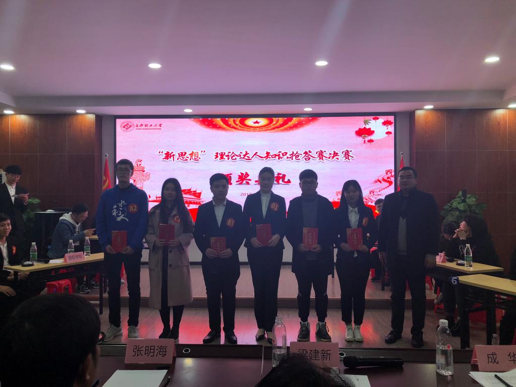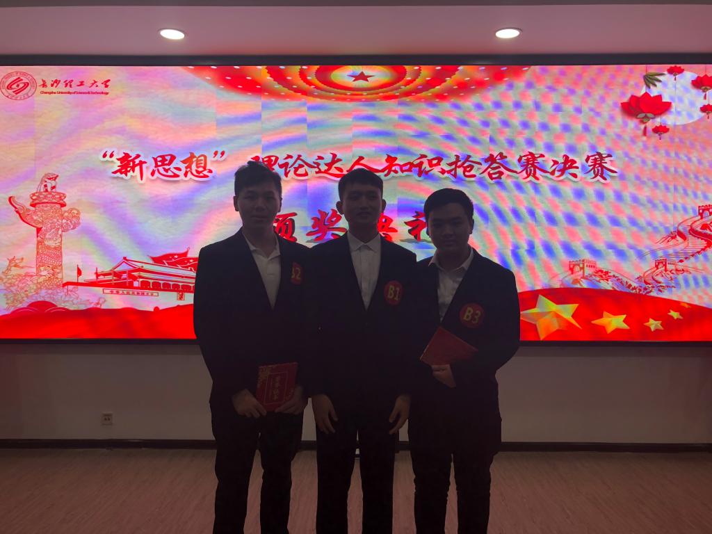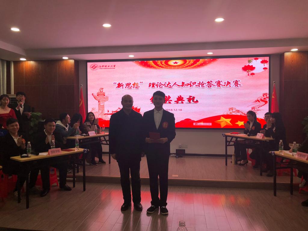 12月18日晚,由校学生工作部(处)主办的永利集团88304官网“新思想”理论达人知识抢答赛决赛在云塘校区工三B319举行。校宣传部、学生工作部(处)等部门负责人和马克思主义学院专家担任大赛评委。2016级学生张微东、刘柯、郭洋代表学院参赛,在决赛中发挥出色,以团体总分第一名的成绩夺得冠军,其中郭洋获评最佳选手。