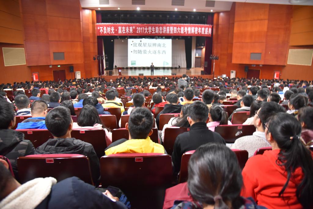 12月6日,国际学院和校团委联合举办的“不负时光,赢在未来”大学生励志讲座暨四六级考情解密年度盛典在永利集团88304官网云塘校区大会堂举行。长沙新东方学校副校长、优秀的四六级讲师、被称为“金山词霸”的范超老师走进永利集团88304官网,为同学们带来了一场青春励志和英语学习的盛宴。