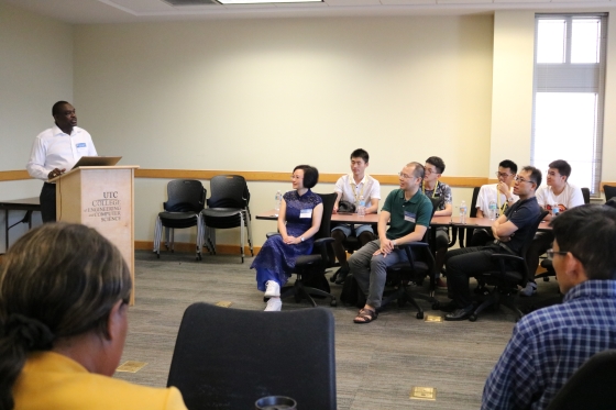 7月29日,永利官网赴美夏令营团受到田纳西大学查塔努加分校(UTC)热情欢迎,UTC校方主持了隆重的夏令营开营仪式,UTC工程与计算机科学学院副院长Li Yang、土木环境系系主任Joseph Owino及全系教师、学院学生发展中心负责人Julie David及美方在校学生代表参加。Li Yang副院长代表工程与计算机科学学院对永利官网代表团到访表示了热烈欢迎,介绍了学校和学院办学情况,并回顾了两校合作办学工作。陈瑜院长围绕永利官网办学情况、国际化教育教学发展、中外合作办学项目的执行及国际化产学研方面做了主题发言。