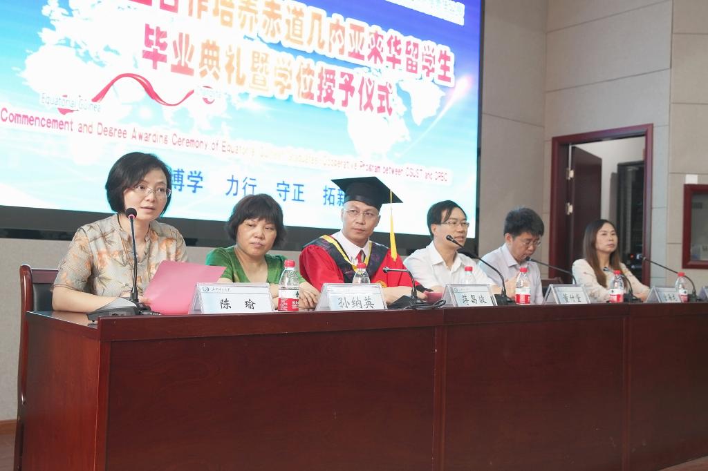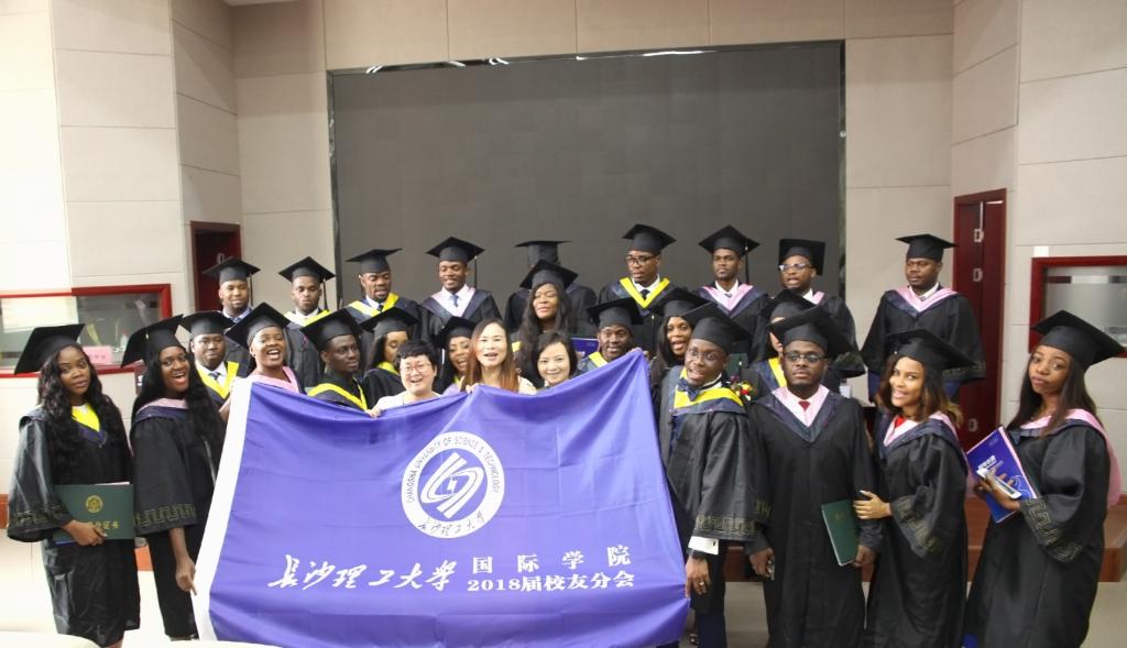 7月12日上午,2018届赤道几内亚来华留学生毕业典礼暨学位授予仪式在云塘校区工二B区多功能厅隆重举行。副校长蒋昌波、校党委委员兼国际学院党委书记付嫦娥、国际交流处处长吴迪龙、校友中心副主任郑延恒、土木工程学院副院长陈伏彬、经济与管理学院副院长谢朝华,留学生资助方中国路桥工程有限责任公司董事、总会计师董付堂、人力资源部副总经理宫海龙、人力资源部许囡,国际化人才培养实习基地湖南路桥建设集团有限责任公司工会主席孙纳英、人力资源部副部长陈新伟出席。参加典礼的还有国际学院国际学生工作办公室全体老师、2018届赤道几内亚毕业生的亲朋好友以及黑山孔子学院到永利官网参加夏令营的全体营员等。毕业典礼由国际学院院长陈瑜主持。
