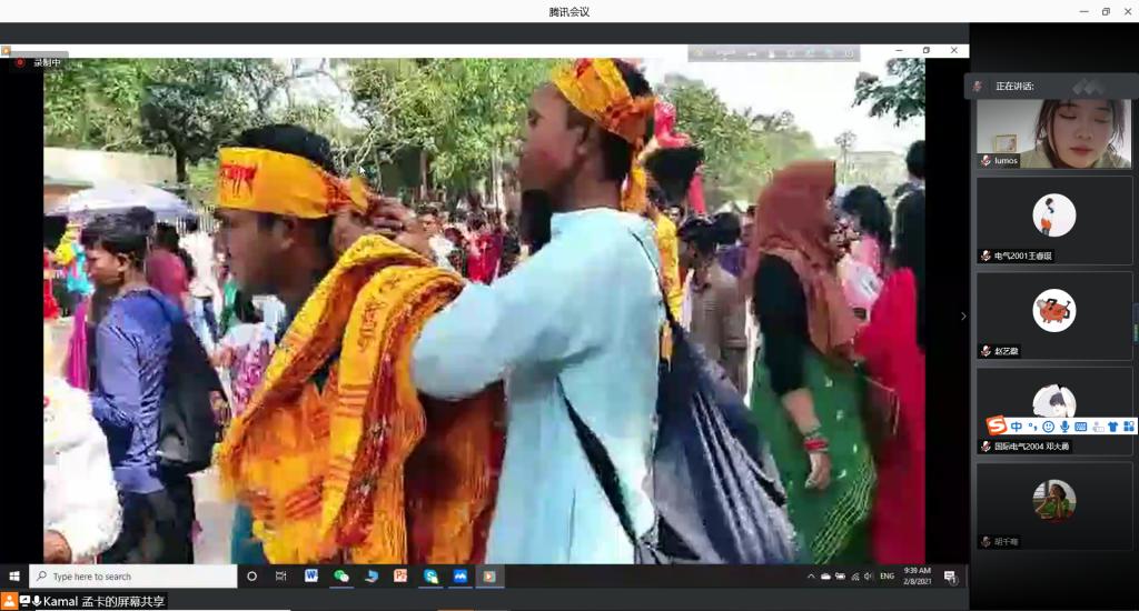 留学生分享了自己国家的新年的习俗,相似之处是大家都会穿上新衣,准备聚会共同庆祝活动,分享新年的喜悦。来自孟加拉国的孟卡向介绍在自己国家的新年,女孩们还会戴上彩色花环,男孩子头上则裹着彩色头巾,男女老少都身着盛装参加盛大的节日游行。除此之外,在这一天,每一个孟加拉家庭还会打扫房子与街道,并用彩色图案“alpana”装饰它们。