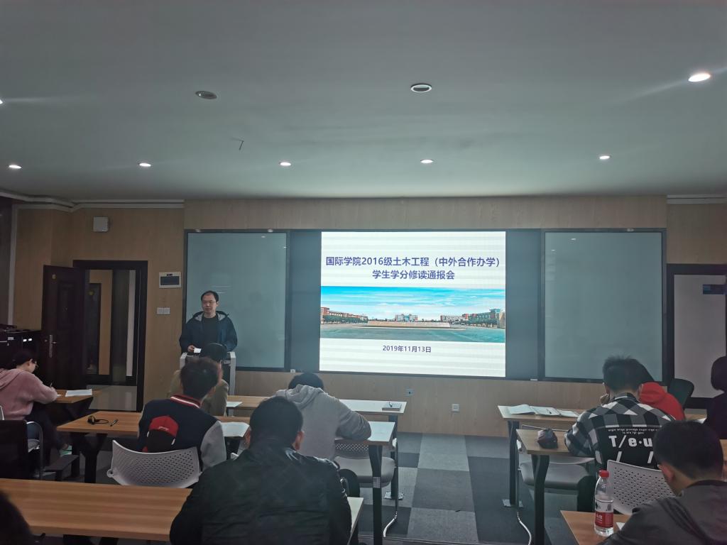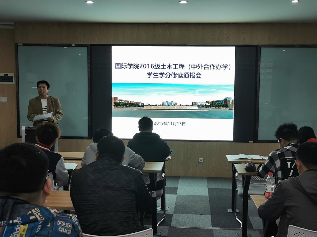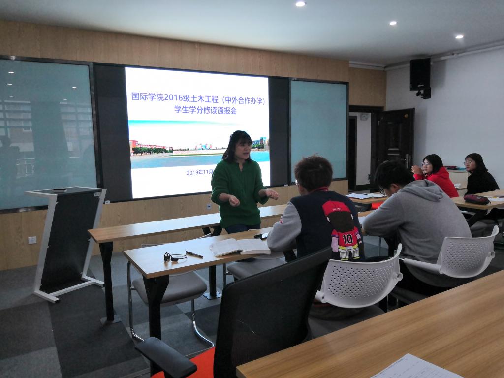 11月13日上午,国际学院2016级土木工程(中外合作办学)学分修读通报会在云塘校区新能源大楼1栋405办公室召开。国际学院党总支副书记吴振华、副院长秦卫星,教务办和学工办老师,及2016级学分修读未达标学生参加会议,会议由吴振华主持。
