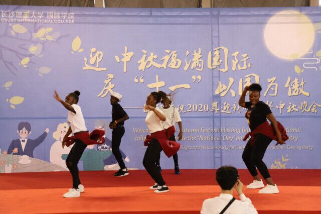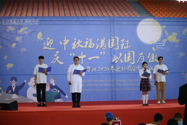 此次晚会由国际学院学生和来华留学生共同参加。晚会在来华留学生的双截棍表演中拉开帷幕,诗朗诵《你信大爱 我信你 抗疫特别篇》歌颂了抗疫过程中的感人事迹,致敬为抗疫作出重大贡献的抗疫英雄。知识抢答——“致敬伟大祖国”中,主持人对有关中国的各类知识进行提问,中外学生纷纷积极参与作答,抢答的特殊形式、特色精美礼品激发了学子们活动参与的积极性、在趣味中进一步了解中国,中外学子更加体会到中华文明的博大精深。各个精彩的歌舞节目彻底打破了中外学子之间的语言障碍,全场共同品味音乐和舞蹈带来的视听盛宴。在书法表演中,国际学子赵胜祥在台上洋洋洒洒写下“最爱湘江两岸山,中秋醉月似故园。贾生莫道凄凉地,神州尽揽四海贤。”的原创诗句,抒发其对湖湘山水的喜爱之情。随后,赵胜祥邀请来华留学生上台共同书写,体会书法的魅力,领略中华传统文化的魅力,提升了来华留学生对中国的热情。晚会在大合唱《仰望星空》中落下帷幕,全体师生共唱,在这个团圆欢庆之际唱出心中期望,寄托对亲友、对祖国的祝福。