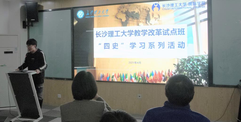 2021年4月16日晚,永利集团88304官网国际学院2019级和2020级教改班全体同学在新能源大楼402教室开展本学期第二场“四史”学习系列活动。校团委书记王学成、国际学院党总支副书记张锐出席。本次活动由2019级教改班团支书张家明和韩璐主持。2019级第一批入党积极分子代表以“百年瞬间、中国精神”为主题展开分享。