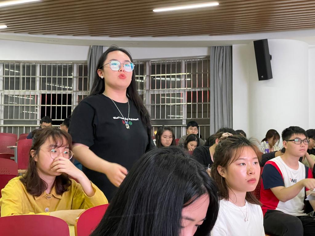 廖志阳以“研学外事礼仪,厚植爱国情怀”为题,首先介绍了基本的外事礼仪相关的概念、基本原则和内涵,图文并茂地讲解了迎送、会见、宴会等外事活动中的规范做法,细致地分享了服饰穿戴、礼宾座次以及其他外事礼仪方面的注意事项。同时,结合自己多年的理论和实践经验,为学生们为带来生动的案例分享,特别提到了他为“杂交水稻之父”袁隆平院士和国外专家交流过程中开展翻译工作的趣事,鼓励学生们在学习专业知识时不但要培养语言表达能力,更重要的是有意识地提升通识能力,要关注国家大事和国际形势。廖志阳谈到,外事情无小事,在外事活动中每个细节都要注意维护祖国的利益,以自己亲身经历的小故事引导学生坚定“四个自信”,坚决做到“两个维护”,不断拓展国际视野,厚植爱国情怀。最后,廖志阳解答了在场学生关于外事礼仪和语言学习方面的问题。