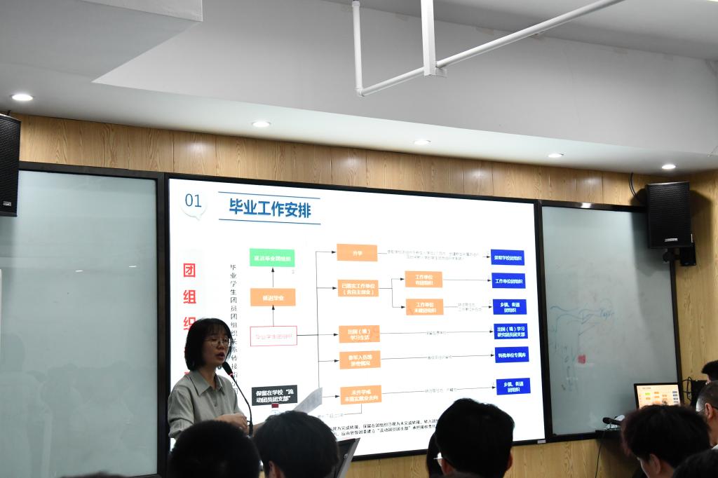 会上,辅导员易芙蓉对毕业工作后续安排进行了详细介绍,对全体学生在毕业期间的管理提出了具体要求,号召毕业生党员,学生干部要率先垂范,主动配合学院开展毕业教育及文明离校等相关工作。院团委书记兼学工办主任马玉文向毕业生详细介绍了团组织关系转出及注意事项。国际学院党委副书记兼副院长乔法光强调全体学生要树立规矩意识,遵守校纪校规,安全有序的离校,增强安全意识,谨防电信网络诈骗,并希望大家做好人生规划,表达了对同学们的殷切希望,倡议毕业生要牢记长理校风学风,增强荣校爱校意识,以校友身份为国家社会发展做出更大贡献。副院长秦卫星结合自己求学经历,鼓励同学们坚持自己的理想,在未来的学习生活中增强信心,勇敢迎接新的征程,不断完成人生新的挑战,同时,介绍了毕业年级同学的学分修读情况,要求大家提高认识站位,认真完成本科阶段的最后一公里,努力为本科阶段画上一个圆满的句号。最后学生代表龚靖茜做毕业生文明离校倡议。