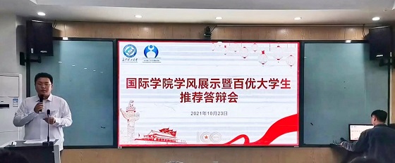 10月23日晚7:00,国际学院学风展示暨百优大学生推荐答辩会在新能源大楼一栋402顺利召开。国际学院特邀党建组织员李争流、校教务处副处长吴伟、院党总支副书记兼副院长乔法光、副院长吴悠、院学工办辅导员马玉文、唐宏敏、易芙蓉、及学生代表参会。