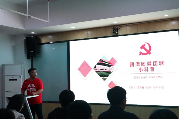 首先,谭哲午带领团员们学习习近平总书记在中国人民大学的讲话精神。他号召同学们共同践行“不负韶华,不负时代,不负人民,在青春赛道上奋力奔跑,争取跑出当代青年的最好成绩。”随后,杨富坤、李家鑫、向科全、龙华强、余福源等7名团员代表从共青团的成立、团旗团徽团歌的规范使用、共青团的章程、早期团员黄爱的故事、张太雷与共青团的故事等角度向大家介绍建团百年来的峥嵘历史,分享自己的思考,团员们的宣讲情绪饱满,他们表达了对悲壮历史的缅怀令人动容,对前辈英雄的敬意,及为祖国建设添砖加瓦的决心与担当催人奋进。