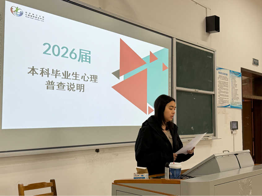 现场学院辅导员张雅雯老师首先就2026届毕业生心理健康普查工作作专项部署。针对我院本科毕业生,现场通过手机登录“学习通”平台完成测评,张老师强调,本次普查是保障毕业生顺利毕业、平安离校的重要环节,旨在全面筑牢学生心理健康防线。