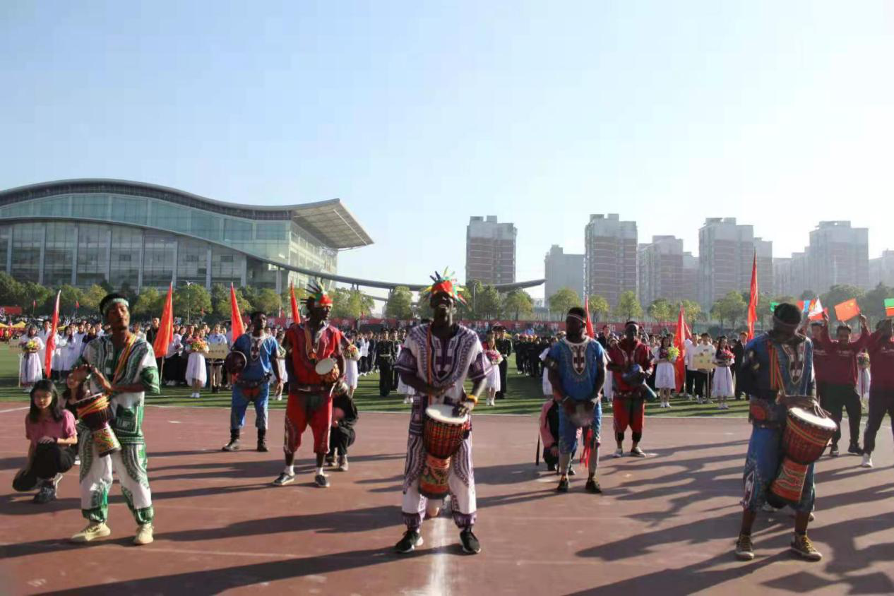 在运动会开幕式上,国际学院方阵的成员手中挥舞着各国旗帜,迈着整齐的步伐,昂扬的走向主席台。留学生们身着民族服装展示了热情洋溢的非洲鼓表演,中国学生的舞蹈散发着朝气蓬勃的气息。他们精神饱满,充分展现了国际青年的风采。