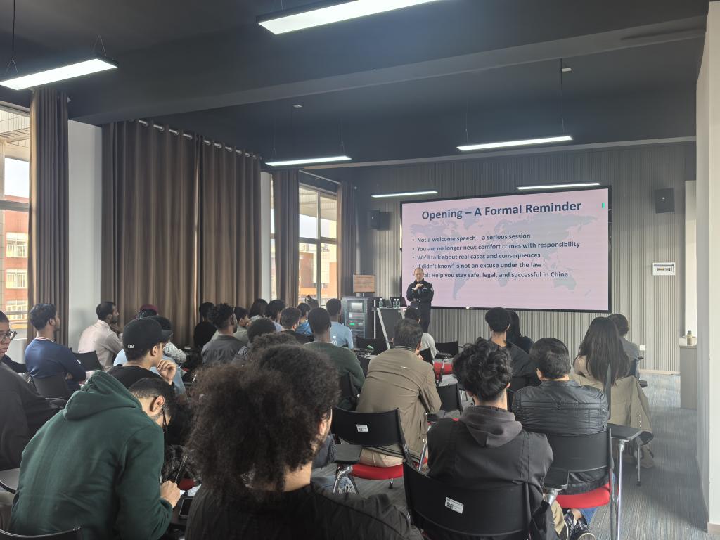 在重点学生座谈会中,外国人管理大队民警刘成亮以“安全与法治”为主题宣讲,解读出入境法律法规重点条款,结合案例提示人身安全、财产保护、社交风险,增强留学生法治意识与自我保护能力。