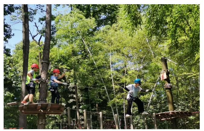 午后小憩,休整充电之后,大家开始挑战“丛林穿越”高空栈道,这项活动更是对队员们胆量和体力的双重考验,在高悬半空的索道上攀网跳墩、踏索飞渡,队员们不断地挑战自我、突破自我。