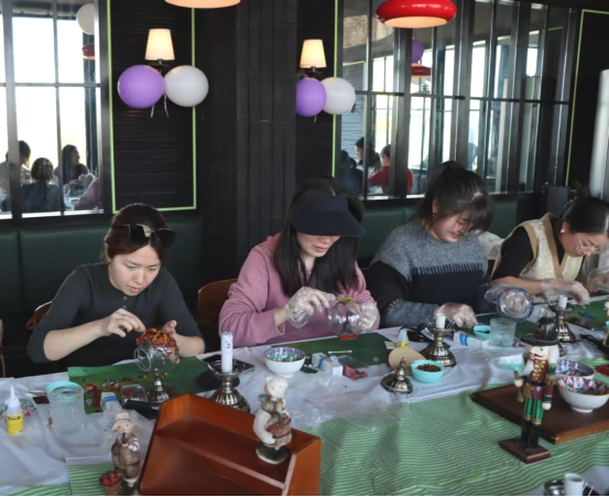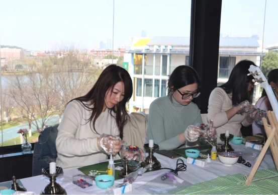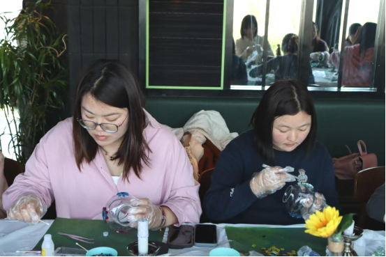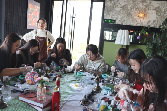 精致午餐、短暂小憩后便开始了“土耳其琉璃灯”制作。在手工老师的详细讲解和指导下,大家的灵感也随之迸发,女神们用自己灵巧的双手,挑选喜欢的彩色琉璃小砖,通过精心设计、拼贴、上胶等工序,为玻璃灯罩附上了土耳其式浪漫色彩,巧妙地将时尚、艺术、趣味等众多元素融合在一起,制作出一盏盏精美而富有特色的琉璃灯。随后,大家围桌而坐,享受静谧而温馨的下午茶,在明媚的阳光下、甜点的香气中开怀畅聊、闲话趣事;正所谓寻常风月,等闲笑谈,称意即相宜。