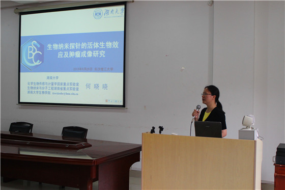 5月25日,应永利集团88304官网化学与生物工程学院邀请,湖南大学化学生物传感与计量学国家重点实验室副主任、生物学院副院长、博士生导师何晓晓教授来永利官网进行学术交流访问。上午10:00,何教授在云塘校区工科三号楼A-320会议室作了题为“生物纳米探针的活体生物效应及肿瘤成像研究”的学术报告,会议由化学学院副院长曹忠教授主持,曹教授首先代表学院向何晓晓教授的到来表示热烈的欢迎,接着介绍了何教授在生物功能化纳米材料及活体分子成像和药物控释载体领域所取得的重要成就。化学学院教师、研究生及本科生百余人聆听了报告。