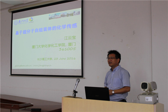 随后,在云塘校区工科三号楼A-320室,江教授结合自己的科研工作,围绕“基于超分子自组装体的化学传感”主题,为学院师生作了精彩的学术报告。江教授详细介绍了超分子聚集体作为化学传感平台的基本原理,例举了其研究组在基于金属配位聚合物、糖分子与硼酸化合物作用等方面所构筑的一些化学传感体系,在重金属离子、糖分子和手性传感方面均有很高的选择性和灵敏度。江教授语言风趣幽默,将学术报告和科研心得耦合穿插,将每一个学术问题化成一段精彩的故事展现给大家,科学与哲学完美结合。