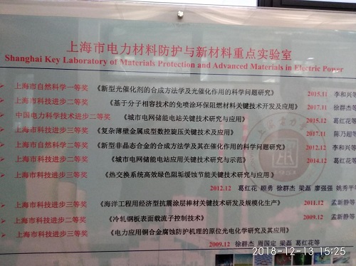 2018年12月13日下午,调研又赶到上海电力大学环境与化学工程学院的杨浦校区实验室,该校区主要是科研实验设备,图7~图8是环境与化学工程学院的科研成果及项目情况照片。