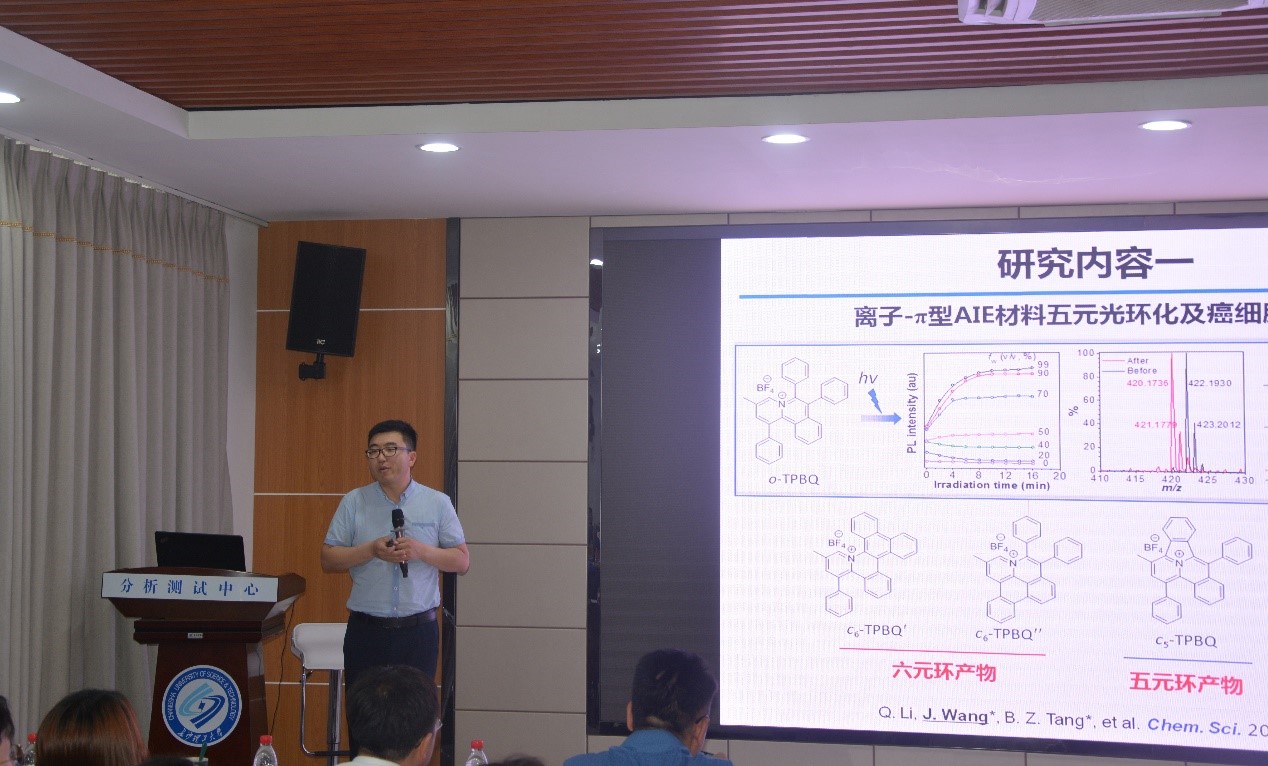 王建国教授作了“聚集诱导发光:从分子设计到应用”的专题报告,从荧光分子在应用中所面临荧光猝灭的问题出发,结合当前聚集诱导发光的研究基础,王教授详细介绍了目前课题组所进行的新型AIE分子设计新策略;以“负离子-p”结合为基础所构建出一系列新型AIE分子,并在生物成像等相关领域进行了实际应用。